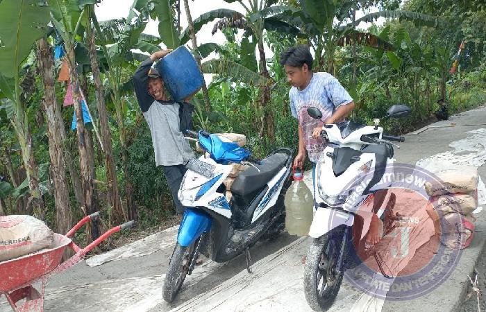 Kalau untuk campuran semen memang pakai air sungai saja dengan membawa drigen dan galon bekas kita usung dengan motor…ya semacam ojek gitu tapi ojek air..ha..haa.., ” jelas Karsono sambil tersenyum