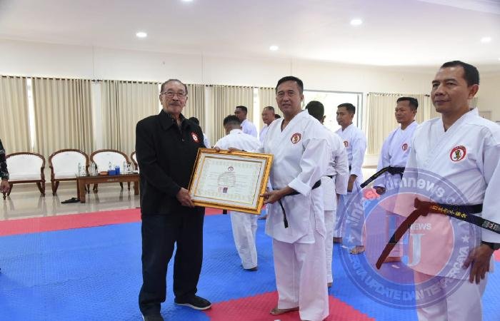 SIDOARJO lintasjatimnews – Komandan Kodiklatal (Dankodiklatal), Letjen TNI Marinir Nur Alamsyah bersama Pejabat Utama (PJU) Kodiklatal menerima Penganugerahan Sabuk Hitam Kehormatan Lemkari dan meresmikan Dojo Hiu Digdaya – 1 Puslatdiksarmil Kodiklatal, bertempat di Puslatdiksarmil, Juanda Sidoarjo. Kamis, (27/02/25).