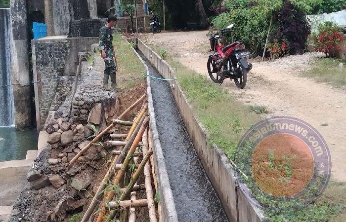 Terlihat Sertu Puji bersama pemilik lahan, Bapak tukilan sedang mengecek dan membersihkan saluran irigasi yang dipenuhi rumput guna mengupayakan normalisasi saluran irigasi secara manual agar memperlancar aliran air ke persawahan warga.