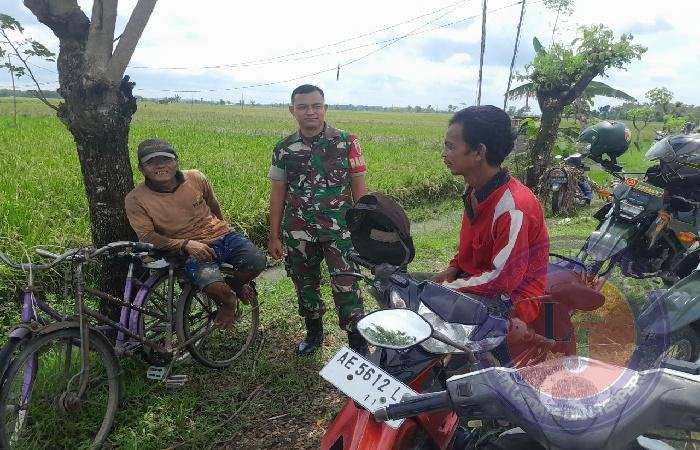 NGAWI lintasjatimnews – Babinsa Koramil 0805/01 Ngawi Kota Serda Arif Andy melaksanakan Komunikasi Sosial (Komsos) dengan warga masyarakat binaan yg sedang melaksanakan istirahat dalam berkerja di sawah untuk persiapan panen padi di Dusun Krawut Desa Mangunharjo Kecamatan Ngawi, Sabtu (08/03/25).
