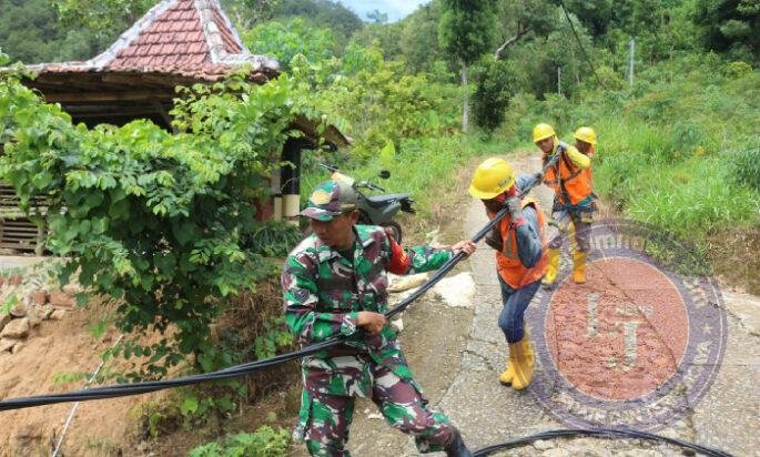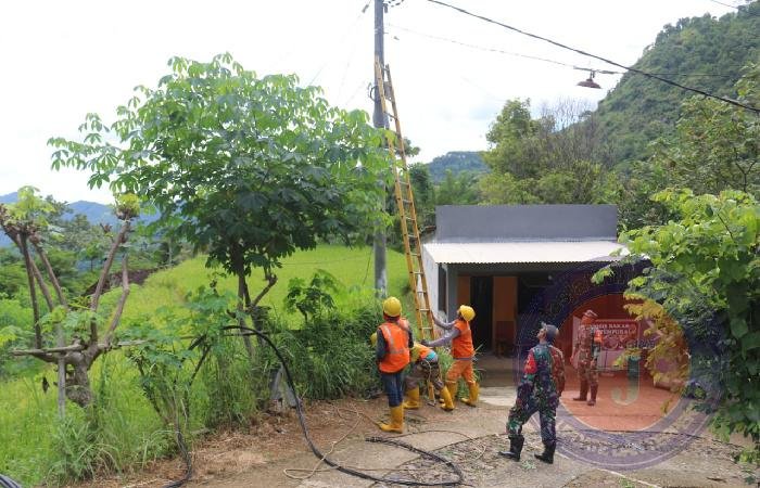 PONOROGO lintasjatimnews – Anggota Koramil Tipe B 0802/10 Slahung, Kodim 0802/Ponorogo melakukan pendampingan terhadap personel PLN yang melaksanakan pemasangan kabel listrik di jalan Jalur Kabel PLN Dukuh Gembes menuju Dukuh Damplok Desa Slahung Kecamatan Slahung Kabupaten Ponorogo, Selasa (11/03/2025).