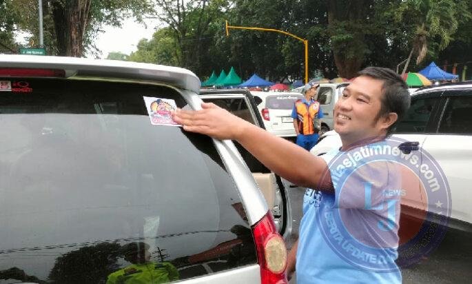 Stiker berisi imbauan dan hotline tersebut dibagikan ke pengendara dan ditempel di kendaraan.