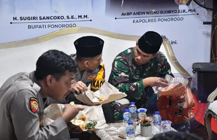 Berbaur bersama anggota TNI dan Polri baik itu yang tergabung dalam patroli maupun anggota yang bertugas di Pos Pam Aloon Aloon, Dandim dan Kapolres Ponorogo melakukan makan sahur bareng dengan menu makanan Nasi Pecel yang merupakan salah satu makanan khas Ponorogo.