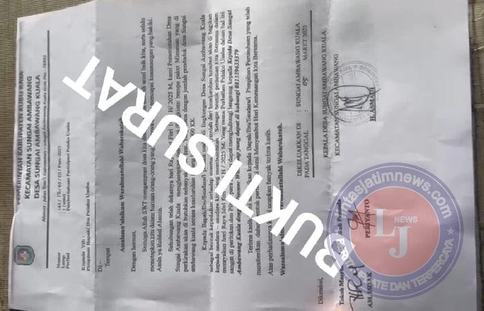 KUBURAYA lintasjatimnews – Beredarnya surat dari Kepala Desa Sungai Ambawang Kuala, Asmadi, yang meminta bantuan 2.000 krat air kaleng kepada pelaku usaha untuk dibagikan ke warga dalam perayaan Idul Fitri 1446 H/2025 M, menuai sorotan. Surat yang ditandatangani Kades dan diketahui tokoh masyarakat serta pemuda ini ramai diperbincangkan setelah tersebar luas.