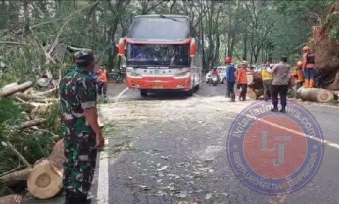 TRENGGALEK lintasjatimnews – Cuaca ekstrem berupa hujan deras disertai angin kencang terus melanda Kabupaten Trenggalek, menyebabkan pohon sengon buto berukuran besar tumbang dan menutup total badan jalan di Jalur Nasional Trenggalek-Ponorogo, Kecamatan Tugu, Rabu (2/4/2025). Akibatnya, akses vital yang menghubungkan antar kabupaten ini lumpuh total, menghambat mobilitas masyarakat dan berpotensi membahayakan pengguna jalan.
