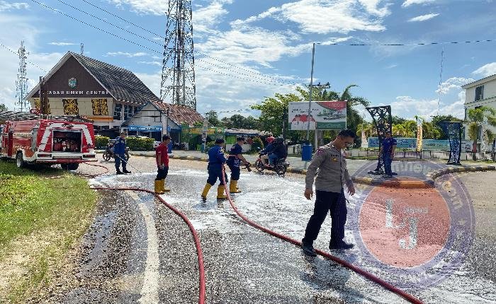 SEKADAU lintasjatimnews – Respons cepat dilakukan oleh personel Pos Pelayanan (Pos Yan) dalam rangka Operasi Ketupat Kapuas 2025 dengan melakukan pembersihan tumpahan solar di depan Bundaran Tugu PKK, Jalan Merdeka Barat, pada Jumat (4/4) siang sekitar pukul 14.30 WIB. Hal ini dilakukan guna mengantisipasi risiko kecelakaan akibat jalan licin.