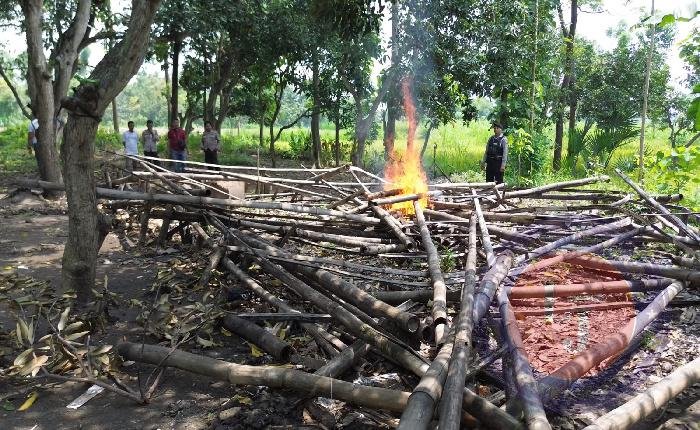 Setelah dilakukan pembongkaran, puing-puing bangunan dibakar agar tidak dapat digunakan kembali.