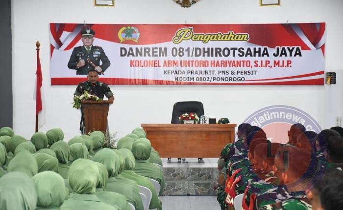 Dihadapan anggota dan Persit Kodim Ponorogo, Danrem 081/Dsj diantaranya mengapresiasi kinerja anggota Kodim 0802/Ponorogo yang selama ini sudah memberikan yang terbaik dalam tugas pengabdian sehari hari termasuk dalam menyukseskan program program Pemerintah.