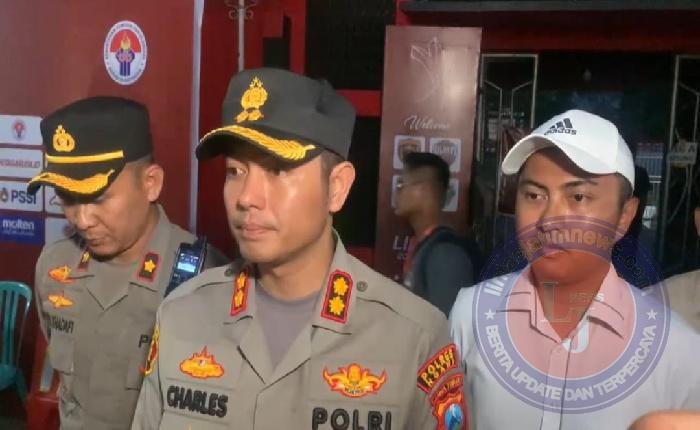Kapolres Ngawi AKBP Charles Pandapotan Tampubolon, S.I.K., S.H., M.H., menghimbau masyarakat dan seluruh penonton serta suporter Liga 4 Indonesia, khususnya yang hadir di Stadion Ketonggo Kab. Ngawi untuk tetap tertib dan menjaga keamanan.