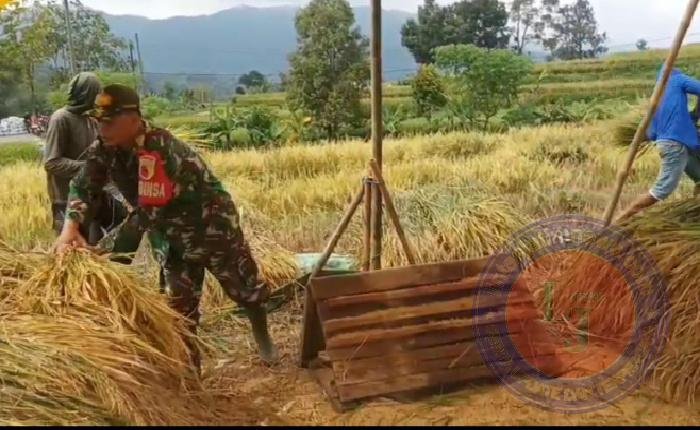 Anggota TNI Kodim Ponorogo Bantu Petani Panen Padi dan Komsos Sergab