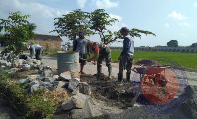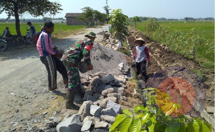 BOYOLALI lintasjatimnews – Babinsa Koramil 11/Ngemplak Kodim 0724/Boyolali Serda Waluyo bersama warga melaksanakan Karya Bhakti pembuat talud Jalan areal persawahan Desa Dibal Kecamatan Ngemplak Kabupaten Boyolali. Senin ( 12/05/25)