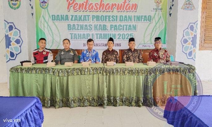 PACITAN lintasjatimnews – Danramil  0801/10 Punung di wakili Pelda Arianto menghadiri kegiatan Pentasharufan atau penyerahan Zakat secara simbolis oleh Badan Amil Zakat Nasional (BAZNAS) Pacitan tahap 1 tahun 2025 bertempat di Aula Kecamatan Punung, Jum’at (16/05/2025).