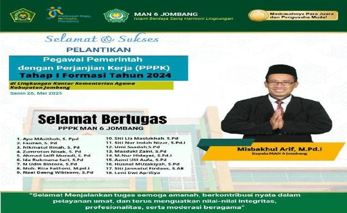Dengan pelantikan ini, MAN 6 Jombang semakin memperkuat komitmennya sebagai lembaga pendidikan yang bermutu, islami, dan berdaya saing. Harapannya, para PPPK yang baru dilantik dapat terus bersinergi dalam mewujudkan madrasah yang unggul dan harmonis.