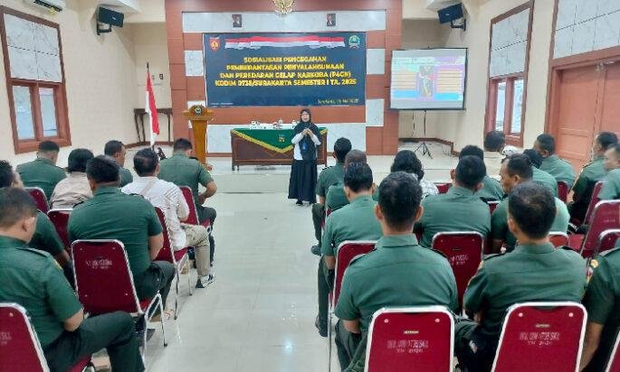 SURAKARTA lintasjatimnews – Komando Distrik Militer (Kodim) 0735/Surakarta menggelar kegiatan Sosialisasi Pencegahan Pemberantasan Penyalahgunaan dan Peredaran Gelap Narkoba (P4GN) Semester I TA. 2025, bagi Prajurit, dan PNS Kodim 0735/Surakarta.