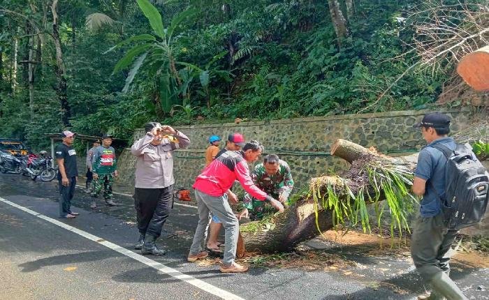 Menanggapi kondisi tersebut, unsur TNI dari Koramil 0806-07/Watulimo, bersama anggota Polsek Watulimo dan Tim Reaksi Cepat (TRC) BPBD Kecamatan Watulimo segera turun tangan. Dengan menggunakan gergaji mesin, tim gabungan sigap memotong dan mengevakuasi batang pohon yang melintang di tengah jalan.