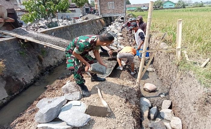 BOYOLALI lintasjatimnews – Babinsa Koramil 08/Banyudono Kodim 0724/Boyolali, Sertu S. Anwar, bersama warga melaksanakan kerja bakti membangun talud jalan dan saluran irigasi di area persawahan Desa Ketaon, Kecamatan Banyudono, Kabupaten Boyolali, pada Sabtu (12/07/25).