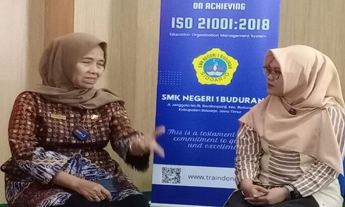 Agustina mengungkapkan, untuk meningkatkan pemahaman para pendidk, tenaga kependidikan dan manajemen sekolah, mengenai prisip dan penerapan ISO 21001 : 2018, pihaknya mengadakan Pelatihan intensif yang antara lain dibimbing oleh Pengawas Pembina SMK 1 Buduran, Dr Deasy Irawati, M.Pd.