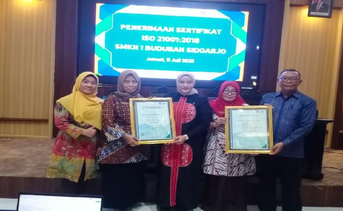 SIDOARJO lintasjatimnews – Satu-satunya Sekolah Menengah Kejuruan (SMK) di Jawa Timur yang memperoleh ISO 21001 : 2018 adalah SMK Negeri 1 Buduran, Sidoarjo. Hal ini terungkap dalam podcast “Munio Goes to School” produksi Stikosa AWS, Jumat (11/7), sekaligus juga penyerahan sertifikat ISO 21001 : 2018 yang diterima oleh Kepala Sekolah SMK Negeri 1 Buduran, Dra Agustina, M.Pd dari Pengawas Pembina, Dr Deasy Irawati, S.Si, M.Pd.