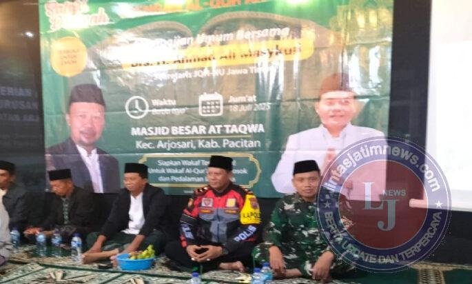 PACITAN lintasjatimnews – Upaya mempererat tali silaturahmi dan memperkuat ukuwah islamiyah, Danramil 0801/03 Arjosari Letda Cke Misrum menghadiri acara Pengajian Umum dalam rangka Safari Dakwah JQH NU Jawa Timur dan Badan Wakaf Al-Quran bersama Drs. H. Ahmad Ali Masykuri, bertempat Di Masjid Besar At Taqwa, Desa Arjosari Kecamatan Arjosari, Kabupaten Pacitan, pada Jumat malam (18/7/2025).