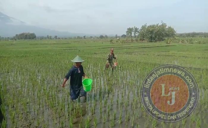 NGAWI lintasjatimnews – Bintara Pembina Desa (Babinsa) Koramil 0805/15 Karanganyar Kodim 0805/Ngawi Sertu Maryono membantu petani saat memupuk padi di lahan milik Bpk Yanto warga Dusun Bedug Desa Sriwedari Kecamatan Karanganyar, Sabtu (26/7/2025).
