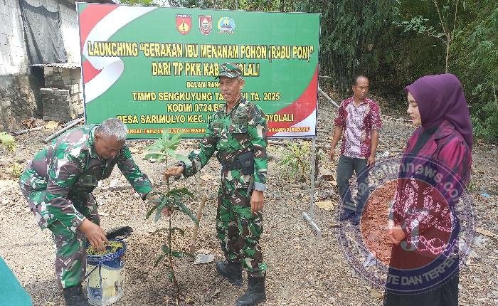 Bersama Ibu-ibu PKK Desa Sarimulyo dan didampingi langsung oleh Ketua TP PKK Kabupaten Boyolali, Ibu Dita Agus Irawan, Satgas TMMD menanam 100 bibit pohon buah. Jenis buah yang ditanam antara lain nangka, mangga kijoy, jambu air, alpukat, dan durian.
