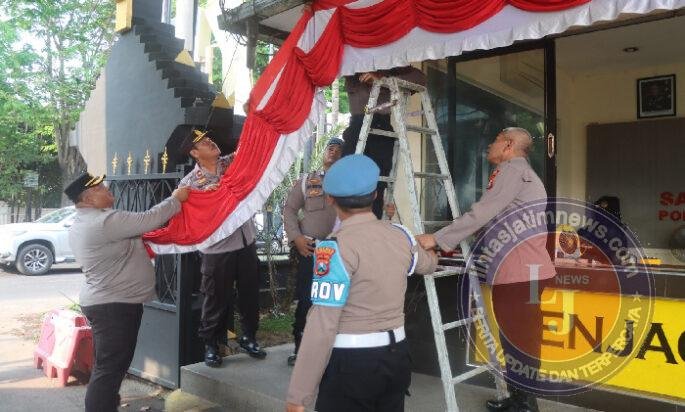 PASURUAN lintasjatimnews — Dalam rangka menyambut dan memeriahkan Hari Ulang Tahun (HUT) ke-80 Kemerdekaan Republik Indonesia, Kapolres Pasuruan bersama pejabat utama (PJU) Polres Pasuruan melaksanakan pemasangan umbul-umbul dan bendera Merah Putih di lingkungan Mapolres Pasuruan, Sabtu (10/8/2025).