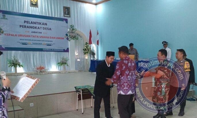 PACITAN lintasjatimnews – Wujud sinergi antara TNI dan pemerintah daerah tingkat Desa, Serma Jaroni selaku Babinsa Koramil 0801/09 Sudimoro menghadiri pelaksanaan kegiatan Pelantikan dan pengambilan sumpah Kaur Tata Usaha dan Umum (TU) perangkat Desa Sukorejo, bertempat di gedung seni budaya, Desa Sukorejo, Kecamatan Sudimoro, Kab.Pacitan, Sabtu (9/8/2025).