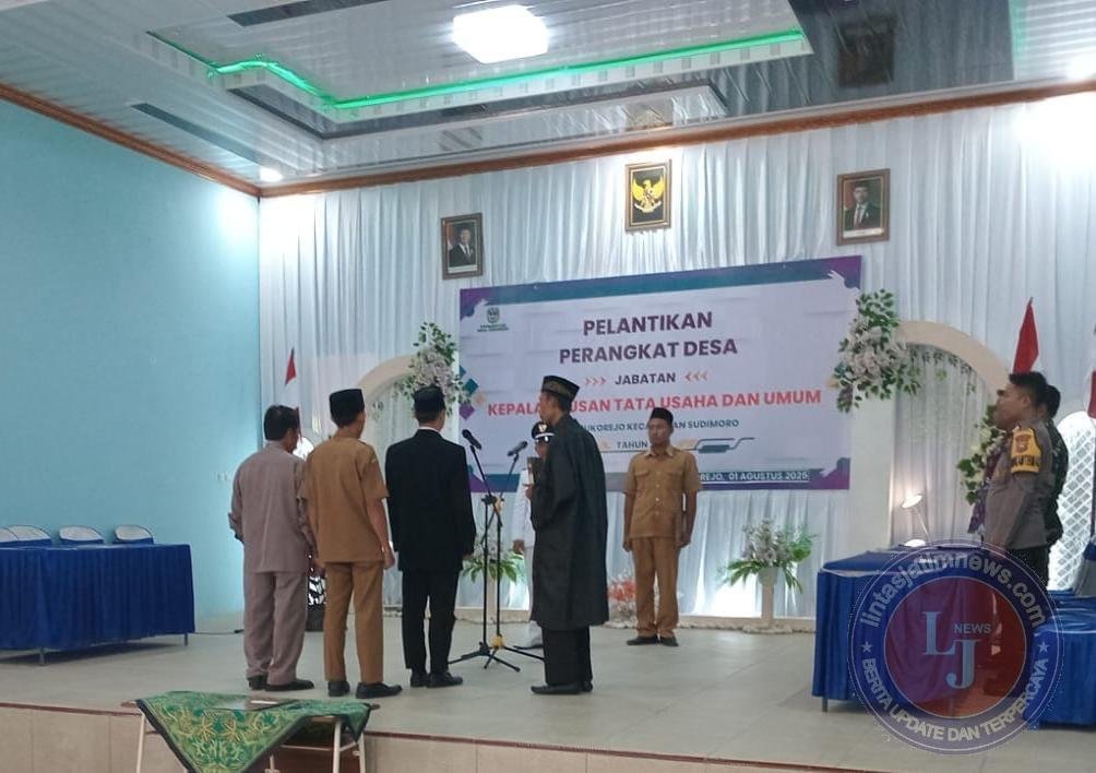 PACITAN lintasjatimnews – Wujud sinergi antara TNI dan pemerintah daerah tingkat Desa, Serma Jaroni selaku Babinsa Koramil 0801/09 Sudimoro menghadiri pelaksanaan kegiatan Pelantikan dan pengambilan sumpah Kaur Tata Usaha dan Umum (TU) perangkat Desa Sukorejo, bertempat di gedung seni budaya, Desa Sukorejo, Kecamatan Sudimoro, Kab.Pacitan, Sabtu (9/8/2025).