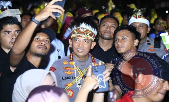 Kapolri Jenderal Listyo Sigit Prabowo hadir langsung di lokasi untuk meninjau jalannya kegiatan dan memastikan seluruh rangkaian berlangsung aman dan tertib. Didampingi Menteri Sekretaris Negara Prasetyo Hadi, Kapolri berkeliling menyapa warga, berdialog dengan peserta karnaval, serta menyaksikan penampilan di panggung rakyat yang menjadi daya tarik utama malam itu.
