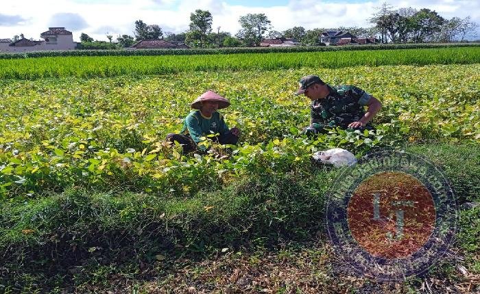 “ Hari ini saya bersama Pak Sodikan salah satu petani yang tergabung dalam Poktan Tani Mulyo Desa Pijeran yang sedang merawat atau mengecek tanaman kedelai di lahan seluas 2 kotak, “ kata Sertu Muhsin Abrori.