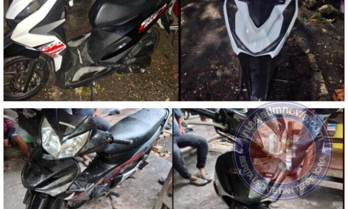Honda Beat warna putih strip biru, Honda Beat warna hitam putih, Honda Vario 125 warna biru, Honda Supra X 125 warna hitam (milik korban).