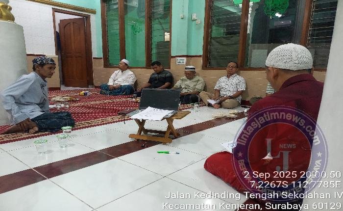 SURABAYA lintasjatimnews – Takmir Masjid At Tiin menggelar rapat persiapan perayaan Maulid Nabi Muhammad SAW pada Selasa (3/9/2025) malam. Rapat yang berlangsung di Masjid At Tiin mulai pukul 19.30 hingga 21.30 WIB ini dipimpin oleh Abah Ali bin Hasyim selaku moderator.