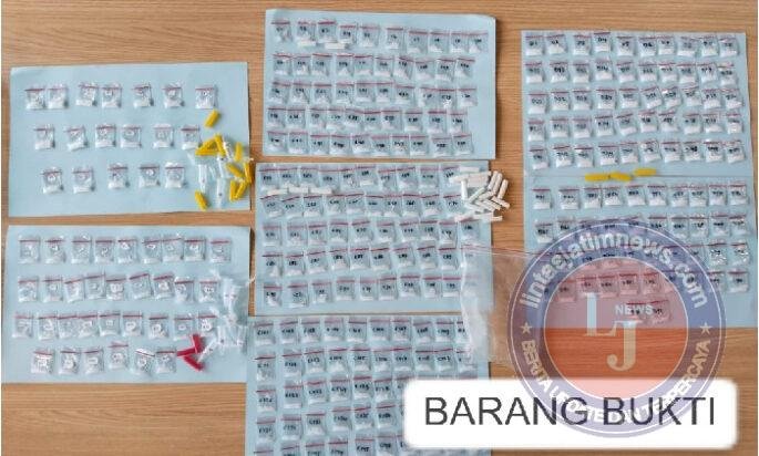 Dari hasil penggeledahan, polisi menyita barang bukti berupa: 293 plastik klip bening berisi sabu dengan berat bruto 76,24 gram; Satu unit handphone Oppo; Satu tas pinggang hitam; Satu timbangan digital, Tiga lakban merah; Satu kardus kecil berisi tabung microtube; Satu paket plastik berisi potongan sedotan warna kuning; Satu paket plastik berisi potongan sedotan warna putih.