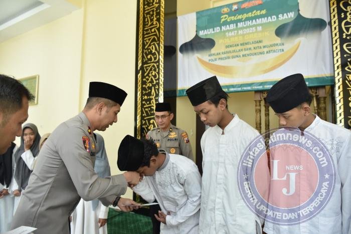 GRESIK lintasjatimnews.com – Polres Gresik menggelar peringatan Maulid Nabi Muhammad SAW 1447 H di Masjid Al-Aziz, kompleks Mapolres Gresik, Kamis (4/9/2025). Acara berlangsung khidmat dengan rangkaian tausiyah keagamaan serta penyerahan santunan kepada puluhan anak yatim.
