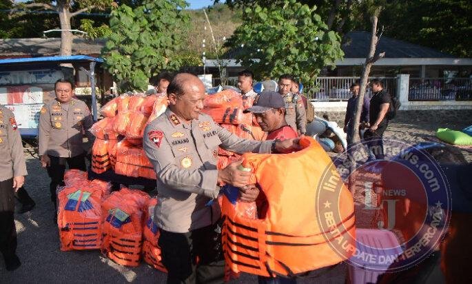Kapolda Jatim juga memberikan rompi pelampung untuk keamanan serta bingkisan sembako untuk para nelayan.
