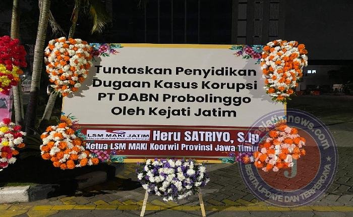 Dalam karangan bunga tersebut, tertulis pesan: “Tuntaskan Penyidikan Dugaan Kasus Korupsi PT DABN Probolinggo oleh Kejati Jatim.” Karangan bunga itu dikirim langsung oleh Ketua MAKI Korwil Jawa Timur, Heru Satriyo, S.Ip.