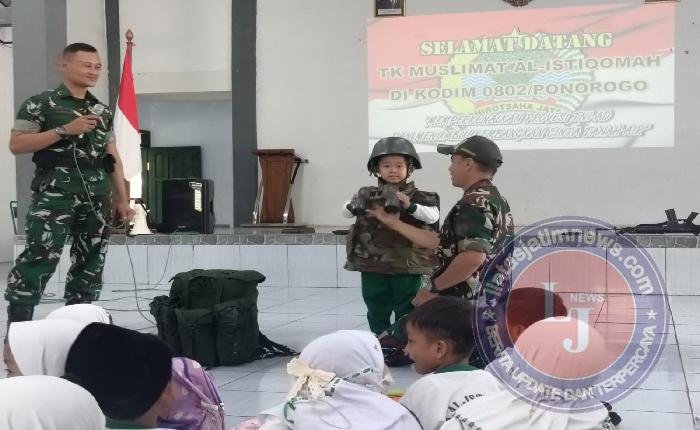 Disini kami mengajak anak-anak untuk mengenal lebih dekat tentang profesi bapak-bapak (TNI) yang ada di Kodim Ponorogo untuk selanjutnya bisa dijadikan pilihan sebagai cita-citanya saat dewasa nantinya, selain itu kami juga mengenalkan kepada anak anak bahwa TNI itu tidak seseram yang mereka bayangkan, mereka takut karna tadi diwaktu datang sudah ada yang menangis dua orang anak, Ungkapnya.