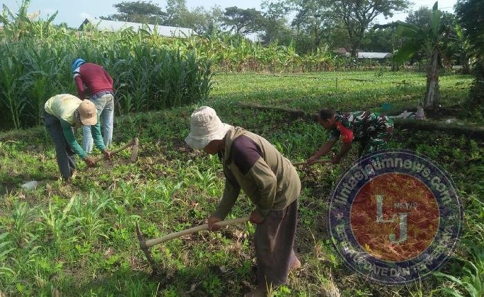 Seperti yang dilakukan Sertu Ari Prasetyo anggota Koramil Tipe B 0802/15 Mlarak, Kodim 0802/Ponorogo yang hari ini turun ke ladang membantu warga Desa / Kecamatan Mlarak Kabupaten Ponorogo) yang sedang melaksanakan kegiatan penyiangan gulma tanaman jagung.