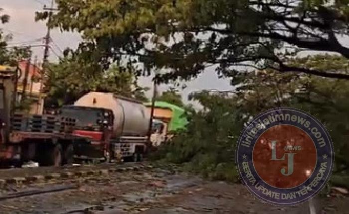 LAMONGAN lintasjatimnews – Hujan deras disertai angin kencang melanda sebagian wilayah Lamongan pada Rabu sore (8/10/2025) dan menimbulkan dampak serius. Sejumlah pohon tumbang di ruas Jalan Nasional Lamongan-Babat, tepatnya di area Kecamatan Sukodadi dan Pucuk.