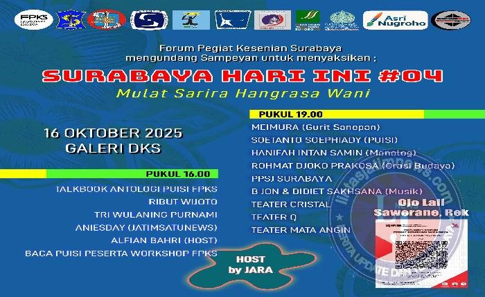 SURABAYA lintasjatimnews – Setelah absen dua bulan, Forum Pegiat Kesenian Surabaya (FPKS) kembali menyelenggarakan programnya pada Oktober 2025, dengan menggelar dua sesi acara pada hari Rabu 16 Oktober besok di Galeri Dewan Kesenian Surabaya, komplek Balai Pemuda, Jl. Gubernur Suryo 15 Surabaya.