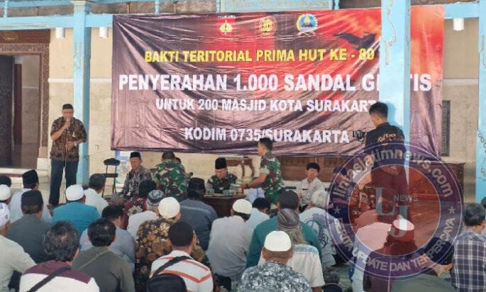 “Dalam rangka memperingati hari ulang tahun ke-80 tni tahun 2025, kami keluarga besar kodim 0735/surakarta merasa bersyukur dapat menyelenggarakan bakti teritorial prima berupa penyerahan 1.000 pasang sandal kepada 200 Masjid di wilayah Surakarta.”tuturnya.