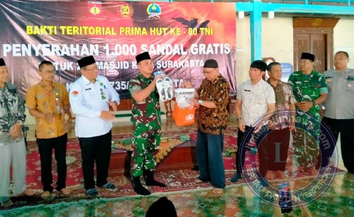 “Dalam rangka memperingati hari ulang tahun ke-80 tni tahun 2025, kami keluarga besar kodim 0735/surakarta merasa bersyukur dapat menyelenggarakan bakti teritorial prima berupa penyerahan 1.000 pasang sandal kepada 200 Masjid di wilayah Surakarta.”tuturnya.