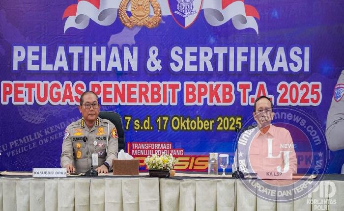 JAKARTA lintasjatimnews – Kegiatan Sertifikasi Petugas Penerbit Buku Pemilik Kendaraan Bermotor (BPKB) Tahun Anggaran 2025 resmi dibuka pada Selasa (14/10/2025) di Cililitan, Jakarta. Pembukaan dilakukan langsung oleh Kasubdit BPKB Ditregident Korlantas Polri, Kombes Pol Sumardji. Kegiatan ini menjadi langkah strategis dalam mendukung transformasi digital layanan kepolisian, termasuk implementasi BPKB elektronik.