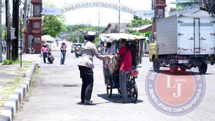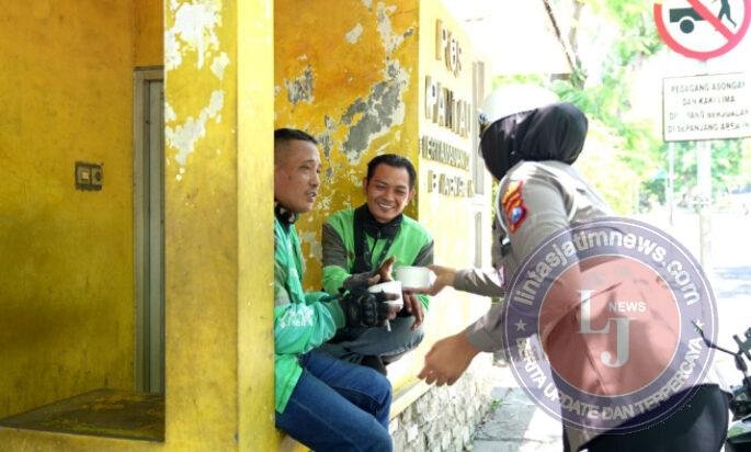 Di salah satu sudut jalan, seorang pedagang keliling tampak berhenti sejenak ketika dihampiri seorang Polwan yang menyodorkan paket makanan sambil tersenyum ramah. “Terima kasih, Bu. Rezeki hari ini,” ucapnya.