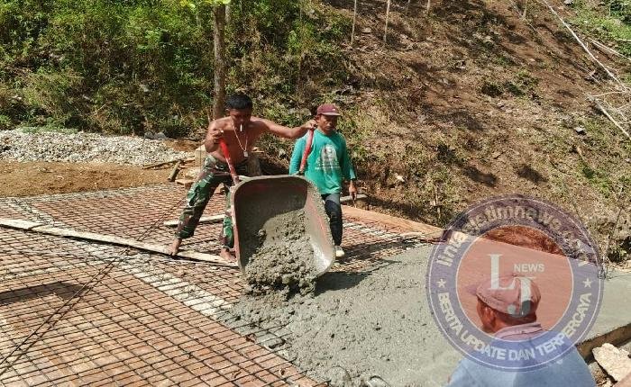 Pengecoran dilakukan secara bergotong-royong oleh prajurit TNI bersama warga, dengan semangat tinggi untuk mempercepat penyelesaian.