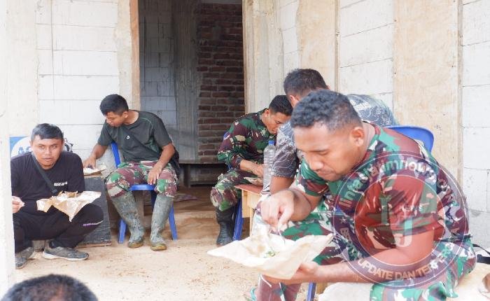 Tidak hanya saat melaksanakan pengerjaan kegiatan sasaran fisik, tetapi momen istirahat siang ini menjadi bukti nyata kebersamaan dan kekompakan antara warga dan anggota TNI. Semua bersatu dalam keseruan saat menikmati makan siang.