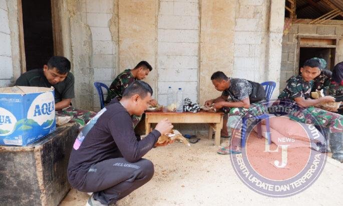 Personel Satgas TMMD ke-126 dan warga Desa Petungsinarang, menciptakan momen tak terlupakan saat mereka makan siang bersama di tengah istirahat siang.