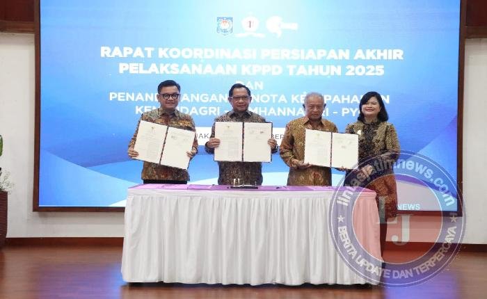 JAKARTA lintasjatimnews – Menteri Dalam Negeri (Mendagri) Muhammad Tito Karnavian bersama Gubernur Lembaga Ketahanan Nasional (Lemhannas) RI Ace Hasan Syadzily dan Ketua Dewan Pembina Purnomo Yusgiantoro Center (PYC) Purnomo Yusgiantoro menandatangani Nota Kesepahaman tentang Pelaksanaan Kursus Pemantapan Pimpinan Daerah (KPPD) Tahun 2025. Langkah ini merupakan upaya Kementerian Dalam Negeri (Kemendagri) dalam meningkatkan kompetensi kepala daerah. Penandatanganan berlangsung di Kantor Lemhannas RI, Jakarta, Jumat (24/10/2025).