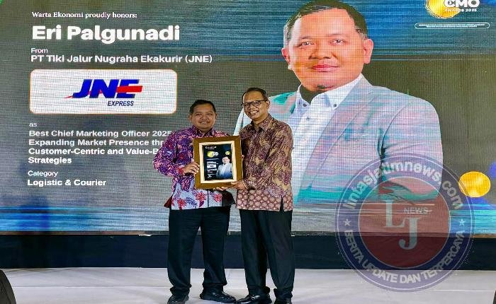 JAKARTA lintasjatimnews – Menjelang perayaan ulang tahun JNE ke-35 pada 26 November 2025, Eri Palgunadi, SVP Marketing Group Head JNE, dinobatkan sebagai Best Chief Marketing Officer (CMO) Award 2025 Expanding Market Presence through Customer-Centric and Value-Based Strategies untuk kategori Logistics & Courier dari Warta Ekonomi. Penghargaan bergengsi ini diserahkan langsung oleh Muhamad Ihsan, CEO & Chief Editor Warta Ekonomi Group, di The Sultan Hotel, Jakarta 31/10 yang lalu, (4/11/25).