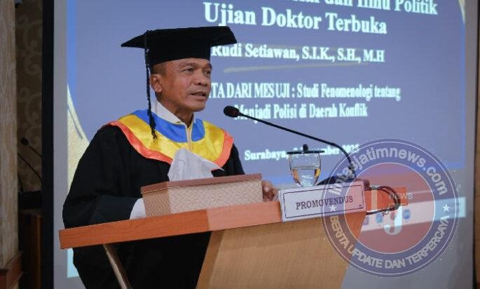 BANDUNG lintasjatimnews – Kapolda Jabar, Irjen Rudi Setiawan menjalani sidang disertasi berjudul ‘Cerita dari Mesuji: Studi Fenomeno logi tentang Menjadi Polisi di Daerah Konflik’ di Universitas Airlangga, Senin (3/11/2025). Irjen Rudi Setiawan dengan penuh percaya diri di hadapan para penguji yang hadir demi menyabet gelar doktor memaparkan tentang menjadi polisi yang profesional, bertanggung jawab, dan berintegritas di wilayah yang penuh masalah, kekerasan masyarakatnya meluas dan melembaga, hingga keberadaan polisi tak pernah diterima sepenuhnya.